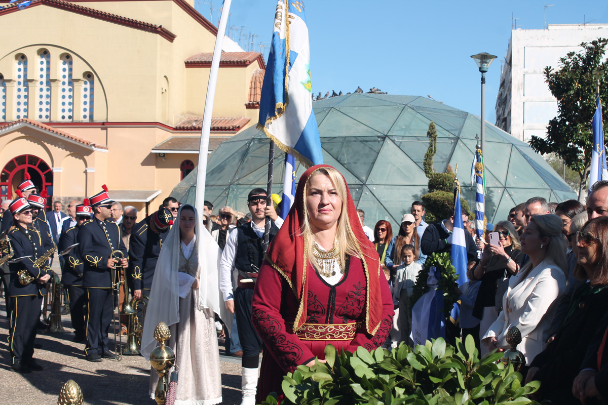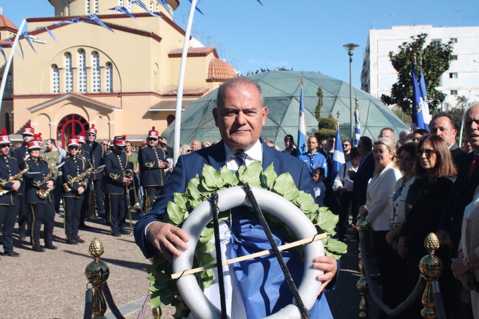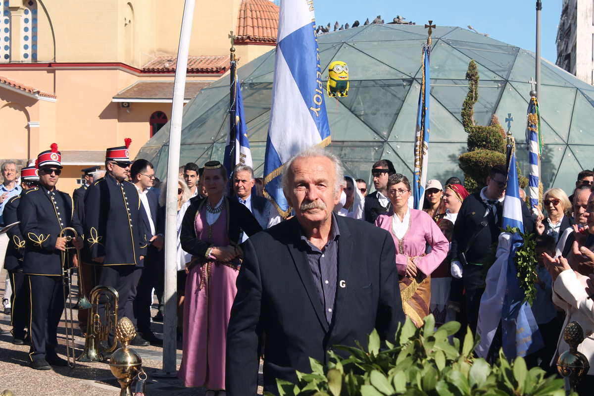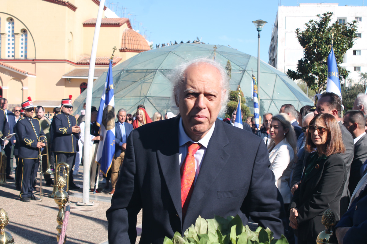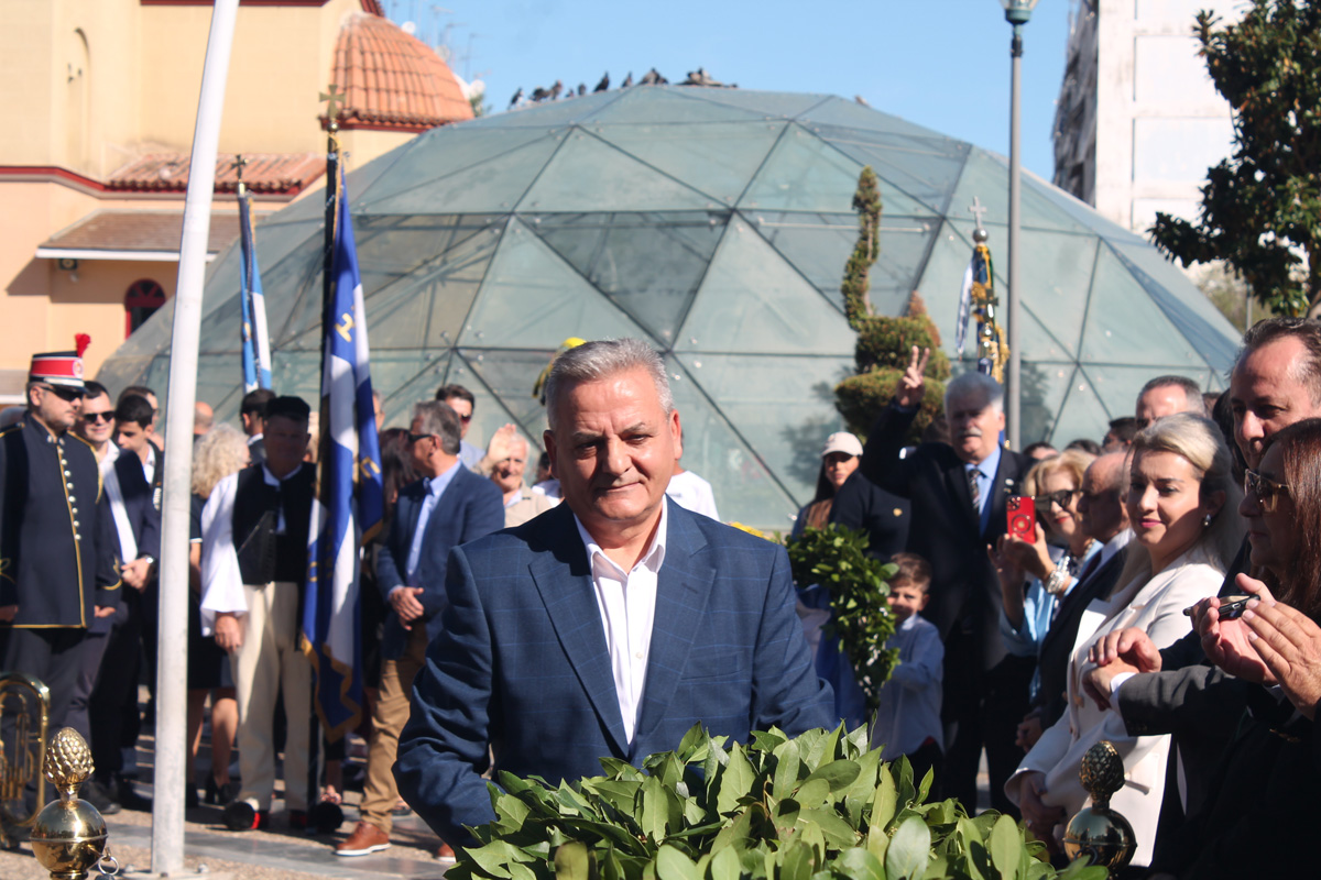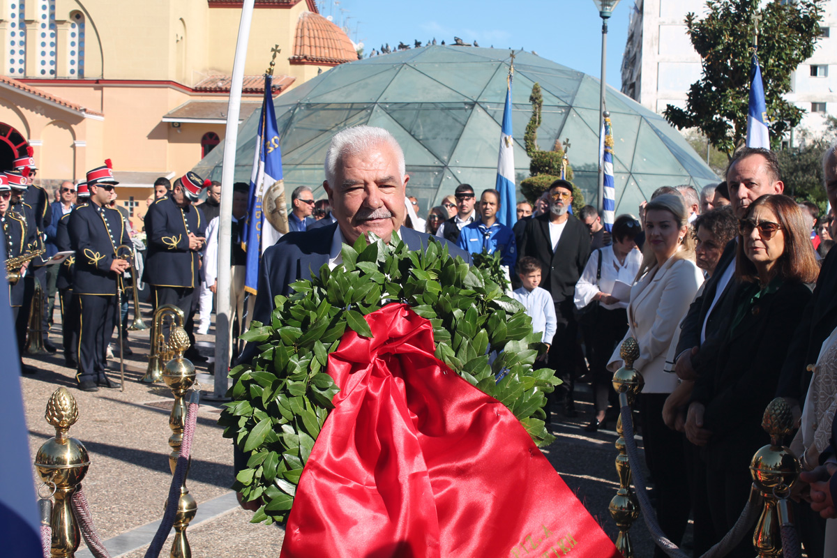 Η κατάθεση στεφάνων ξεκίνησε, όχι από τη καθιερωμένη κατάθεση του Δημάρχου, φυσικά, αλλά από τον αντικαταστάτη του, Αντιδήμαρχο Καθαριότητας, Παναγιώτη Λύκο και συνεχίστηκε από τις πολιτικές και δημοτικές παρατάξεις, τις ένοπλες δυνάμεις και τους τοπικούς συλλόγους.