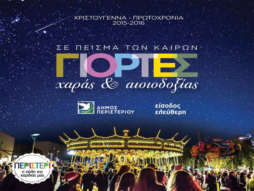 Ο Δήμος Περιστερίου φοράει το γιορτινό του χαμόγελο και σε πείσμα των καιρών μετατρέπει τις γιορτές των Χριστουγέννων και της Πρωτοχρονιάς σε ημέρες χαράς και αισιοδοξίας. Στόχος και φέτος είναι να γεμίσει η πόλη με χαρούμενα πρόσωπα και η νέα χρονιά να μας βρει όλους με διάθεση θετική.