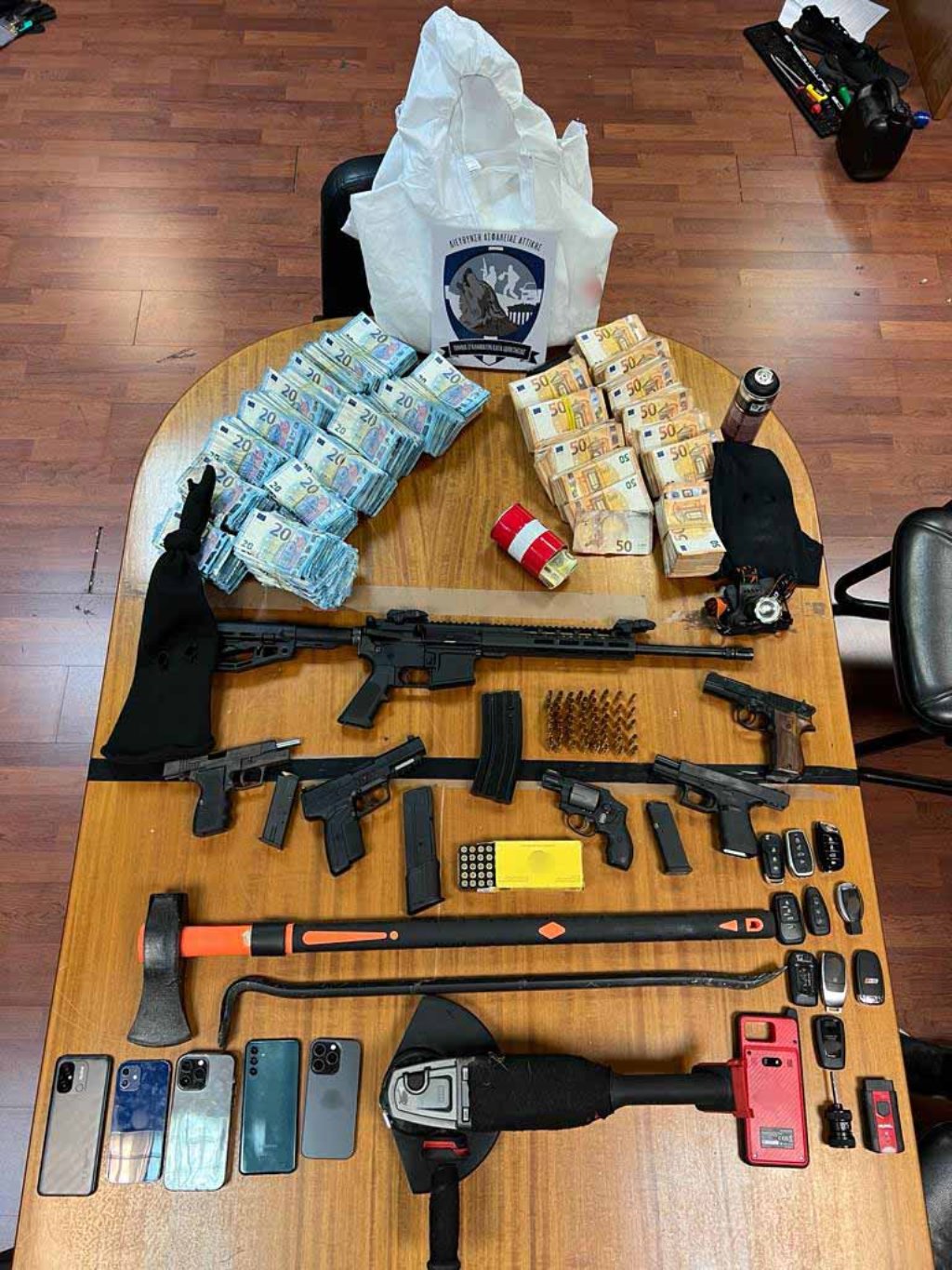 Κατά τις έρευνες που πραγματοποιήθηκαν από τους αρμόδιους αστυνομικούς, κατασχέθηκαν, μεταξύ άλλων, πολεμικό τυφέκιο, πιστόλια, φυσίγγια, ποσότητες εκρηκτικής ύλης, εξοπλισμός αφαίρεσης οχημάτων, τρία αυτοκίνητα, δύο μοτοσυκλέτες καθώς και μεγάλο χρηματικό ποσό.