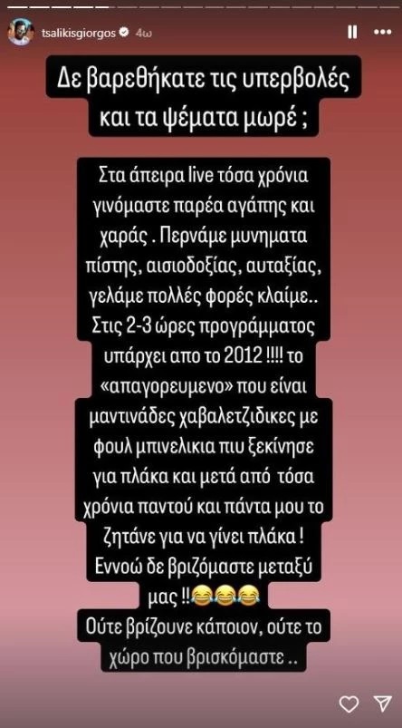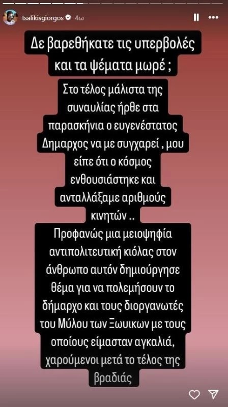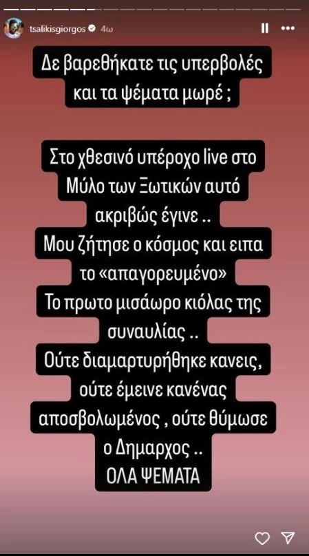 Στην απάντησή του ο Γιώργος Τσαλίκης αναφέρει: «Δεν βαρεθήκατε τις υπερβολές και τα ψέματα μωρέ; Στο χθεσινό υπέροχο live στον Μύλο Των Ξωτικών αυτό ακριβώς έγινε. Μου ζήτησε ο κόσμος και είπα το “απαγορευμένο”. Το πρώτο μισάωρο κιόλας της συναυλίας. Ούτε διαμαρτυρήθηκε κανείς, ούτε έμεινε κανένας αποσβολωμένος, ούτε θύμωσε ο Δήμαρχος. Όλα ψέματα».