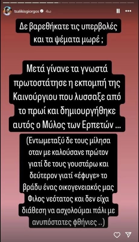 «Μετά γίνανε τα γνωστά, πρωτοστάτησε η εκπομπή της Καινούργιου που λύσσαξε από το πρωί και δημιουργήθηκε ο Μύλος των Ερπετών. Εν τω μεταξύ δεν τους μίλησα όταν με καλούσαν, πρώτον γιατί δεν τους γουστάρω και δεύτερον γιατί “έφυγε” το βράδυ ένας οικογενειακός φίλος νεότατος και δεν είχα διάθεση να ασχολούμαι πάλι με ανυπόστατες φθήνιες» συμπλήρωσε ο τραγουδιστής.