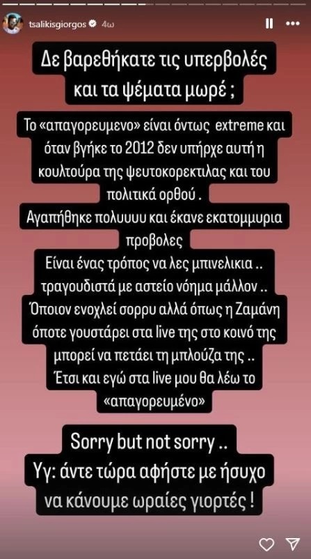 Απάντηση μετά τον σάλο που προκάλεσε η εκτέλεση του τραγουδιού του «Απαγορευμένο» στην έναρξη του «Μύλου των Ξωτικών» στα Τρίκαλα, μπροστά σε πολλά ανήλικα παιδιά, έδωσε ο Γιώργος Τσαλίκης μέσα από τα social media.