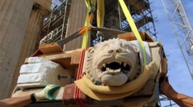 Η εμβληματική λεοντοκεφαλή της δυτικής όψης του Παρθενώνα «κατέβηκε» την Πέμπτη από την κορυφή του ναού μέσα σε επτά λεπτά, με τη βοήθεια ενός γερανού. Θα βρίσκεται στο εργαστήριο για συντήρηση και αναμένεται να τοποθετηθεί πάλι στη θέση του μέχρι το 2013.