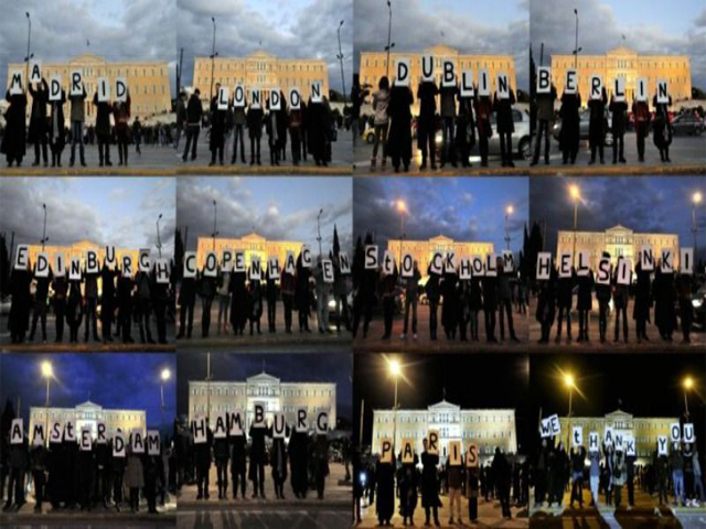 Έλληνες διαδηλωτές στο Σύνταγμα, με φόντο την Ελληνική βουλή, κρατούσαν πλακάτ, σχηματίζοντας τα ονόματα των μεγάλων ευρωπαϊκών πόλεων στις οποίες έλαβαν χώρα εκδηλώσεις συμπαράσης.