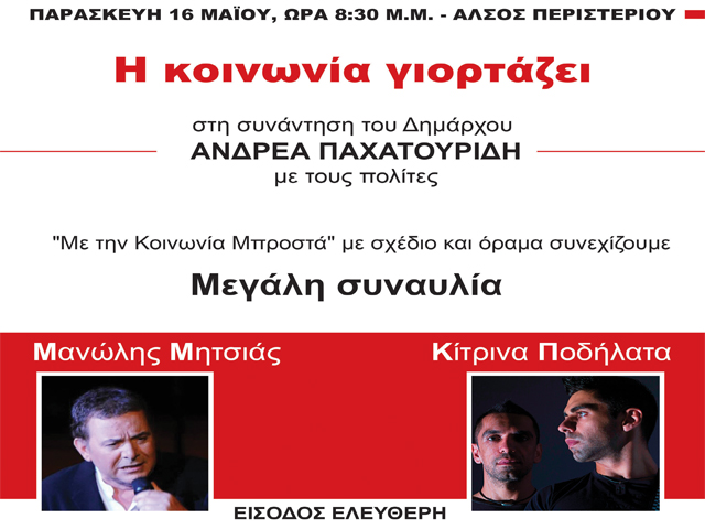 Ο Δήμαρχος Ανδρέας Παχατουρίδης και τα μέλη της παράταξης “Με την Κοινωνία Μπροστά” ΕΥΧΑΡΙΣΤΟΥΝ το μεγάλο καλλιτέχνη ΜΑΝΩΛΗ ΜΗΤΣΙΑ και τα παιδιά της πόλης Γιώργο και Αλέξανδρο Παντελιά (ΚΙΤΡΙΝΑ ΠΟΔΗΛΑΤΑ) για την αφιλοκερδή συμμετοχή τους στη γιορτή της κοινωνίας την Παρασκευή 16 Μαΐου 2014, ώρα 8:30μ.μ. στο Άλσος Περιστερίου.