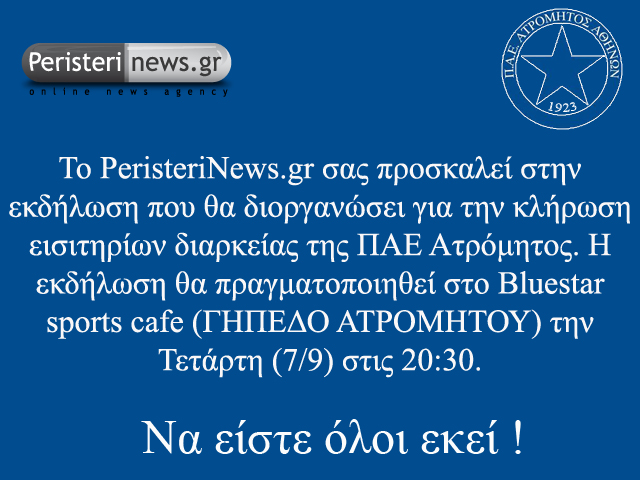 Το PeristeriNews.gr σας προσκαλεί στην εκδήλωση που θα διοργανώσει για την κλήρωση εισιτηρίων διαρκείας της ΠΑΕ Ατρόμητος.