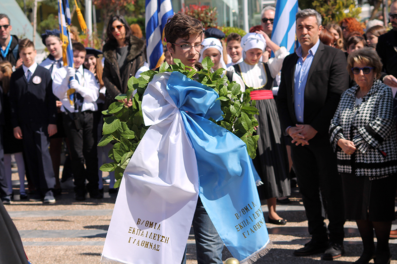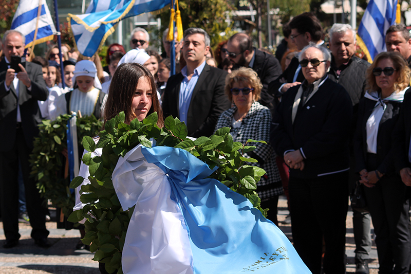 Oι σημαιοφόροι και οι παραστάτες μαθητές των σχολείων καθώς και οι εκπρόσωποι φορέων και συλλόγων της πόλης του Περιστερίου απέδωσαν με εθνική υπερηφάνεια φόρο τιμής στην επέτειο της επανάστασης του 1821 στο Μνημείο των Πεσόντων, στην κεντρική πλατεία της πόλης.
