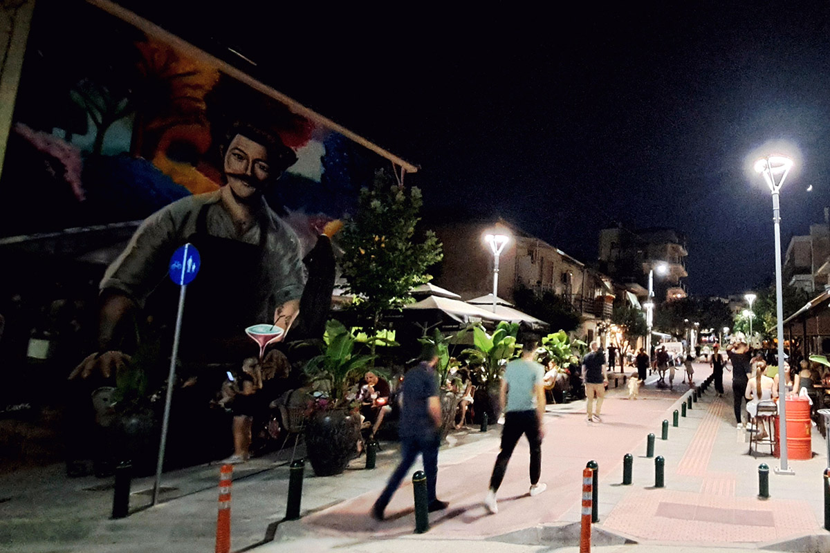 Το βράδυ, ο πεζόδρομος μεταμορφώνεται σε σημείο συνάντησης για όλες τις ηλικίες, με έντονη κοινωνική και πολιτιστική ζωή.