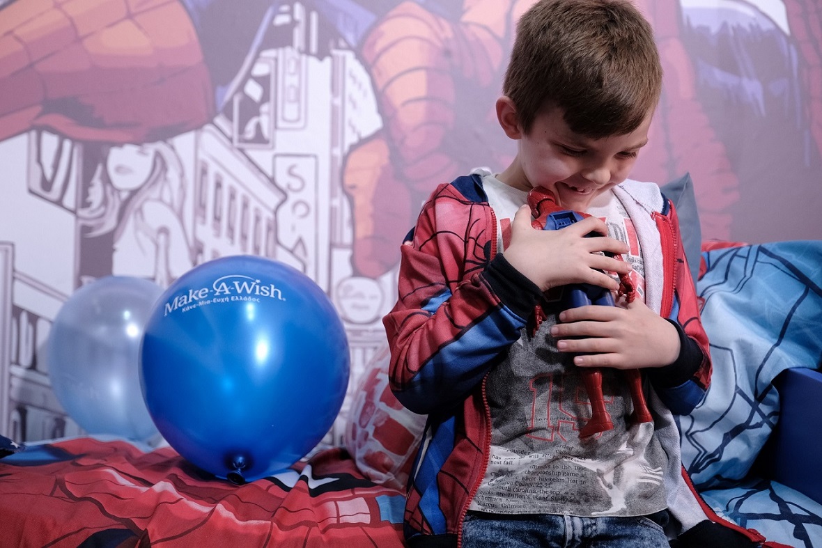 Η ευχή του, να αποκτήσει ένα δωμάτιο γεμάτο σούπερ ήρωες για τον ίδιο και κούκλες για την αδελφή του, έγινε πραγματικότητα από τον ΟΠΑΠ, στο πλαίσιο της πρωτοβουλίας “MAD for a Cause”, η οποία θα κάνει πραγματικότητα ακόμη δύο ευχές παιδιών του Make-A-Wish (Κάνε-Μια-Ευχή Ελλάδος) έως τις 3 Ιουνίου.