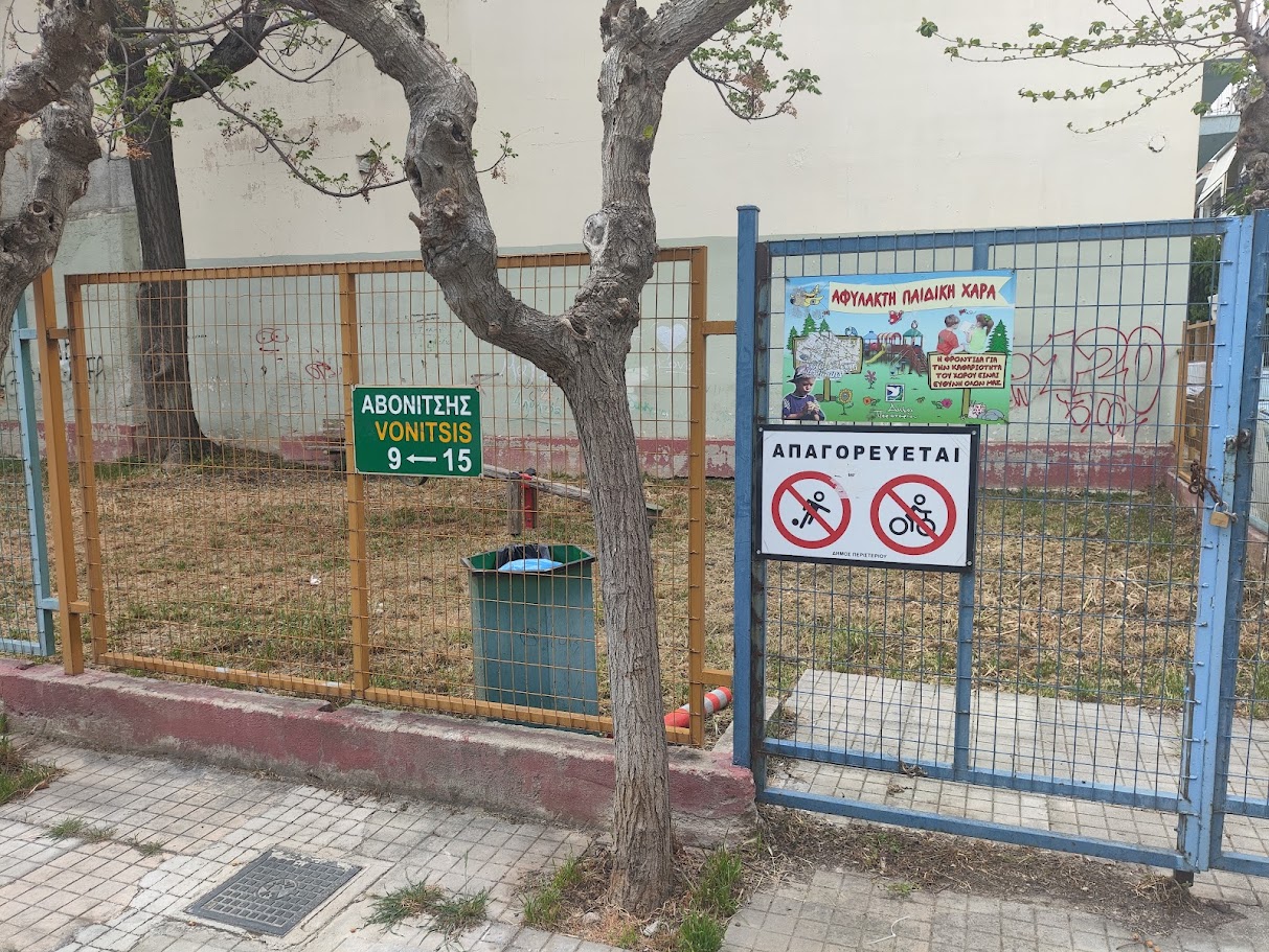 Ο συγκεκριμένος χώρος (γιατί παιδική χαρά δεν λέγεται) βρίσκεται στην οδό Αβονίτσης, λίγα τετράγωνα από το Δημοτικό Στάδιο Περιστερίου.