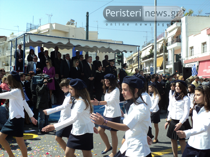 Παρά τις επεισόδια, κανονικά πραγματοποιήθηκε η παρέλαση της 25ης Μαρτίου στο Περιστέρι. Χιλιάδες Περιστεριώτες θαύμασαν τα νιάτα της πόλης μας, επί της Λεωφόρου Παν. Τσαλδάρη. Μέρος πήραν οι μαθητές των σχολείων με μονό αριθμό, τα ιδιωτικά σχολεία “Αυγουλέα-Λιναρδάτου” και “Τσιαμιούλη” και φορείς της πόλης μας.