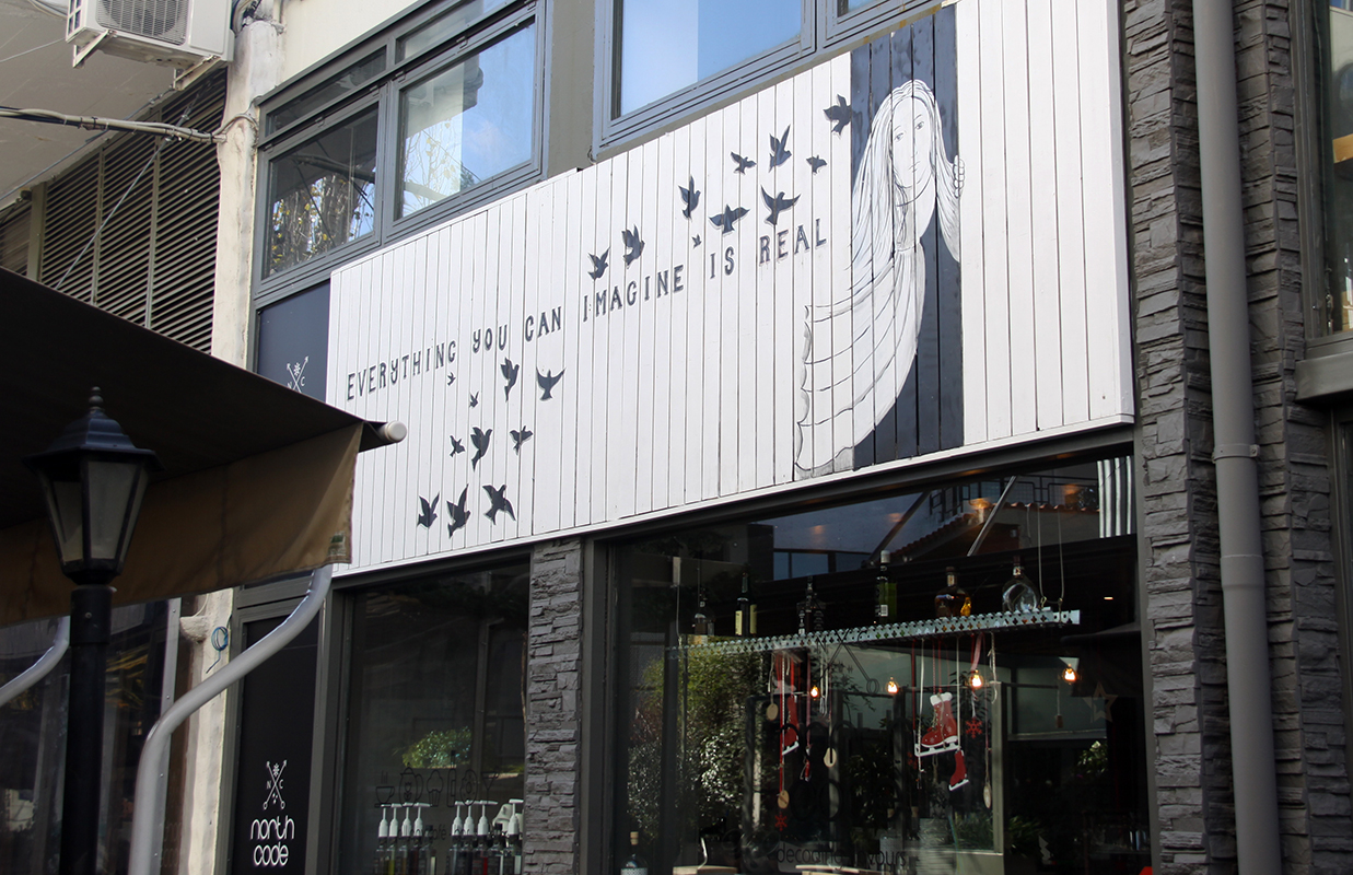 Εδώ και λίγες μέρες οι εξωτερικές επιφάνειες των καταστημάτων έχουν αλλάξει πρόσωπο, αφού εκτός από την καθιερωμένη σύνθεση κλασσικών χρωμάτων που υπάρχουν έξω από τα μαγαζιά, πλέον είναι διακοσμημένα με όμορφες ζωγραφιές.