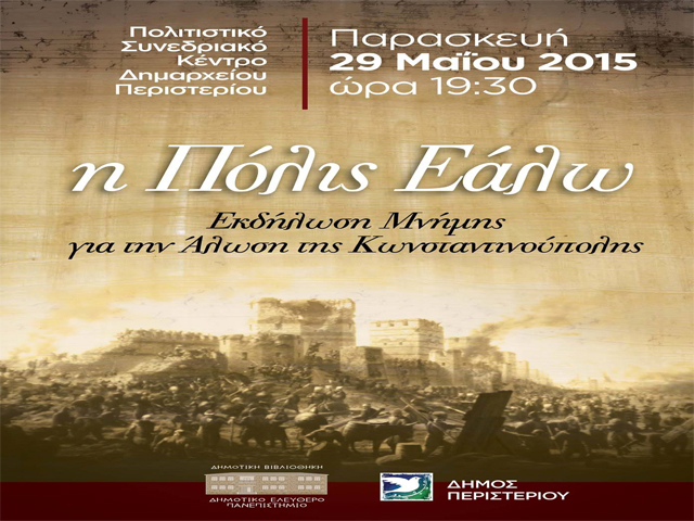 Εκδήλωση μνήμης για την άλωση της Κωνσταντινούπολης, την Παρασκευή 29 Μαΐου 2015, ώρα 19.30, στο Πολιτιστικό – Συνεδριακό Κέντρου του Δημαρχείου (Καραθεοδωρή & Εθν. Αντιστάσεως), Σταθμός Μετρό “Περιστέρι”.