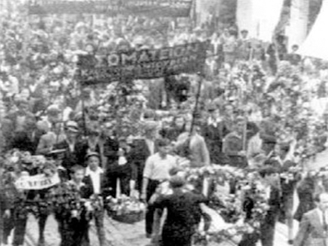 Στη Θεσσαλονίκη, επεμβαίνει η Αστυνομία και συλλαμβάνονται οι ηγέτες της Φεντερασιόν, Αβραάμ Μπεναρόγια, Σαμπετάι Λεβί και Σαμουήλ Γιονά.
