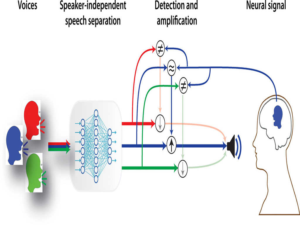 Ερευνητές στις ΗΠΑ δημιούργησαν την πρώτη «έξυπνη» συσκευή υποβοήθησης της ακοής, η οποία «διαβάζει» το μυαλό του χρήστη και έτσι μπορεί σε πραγματικό χρόνο να εστιάσει επιλεκτικά σε συγκεκριμένες φωνές στο περιβάλλον.