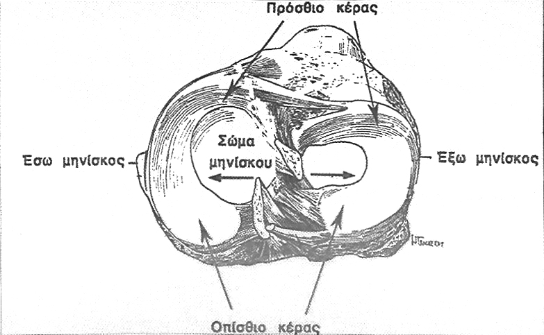 Οι μηνίσκοι είναι δύο για κάθε γόνατο, ο έσω και ο έξω και παρεμβάλλονται μεταξύ μηρού και κνήμης. Έχουν μορφή ημισελινοειδή, ο έξω μηνίσκος ομοιάζει περισσότερο με κλειστό κύκλο. Ο κάθε μηνίσκος αποτελείται από το σώμα και τα δύο κέρατα, το πρόσθιο και το οπίσθιο (εικόνα 1). Η διατομή τους είναι σφηνοειδής, με τη βάση προς την περιφέρεια όπου προσφύονται με το θύλακο και με την κνήμη με τους κορωνοειδείς συνδέσμους. Η επάνω επιφάνεια του μηνίσκου είναι κοίλη, ενώ η κάτω είναι επίπεδη. Ο έξω μηνίσκος είναι περισσότερο κινητός, γι’αυτό τραυματίζεται σπανιότερα.