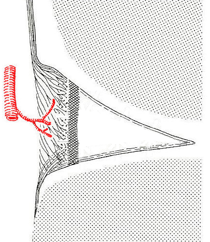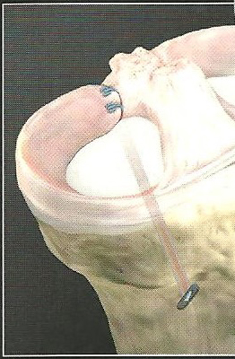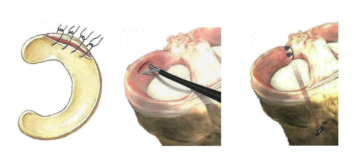 Όσον αφορά στην συρραφή του μηνίσκου (εικόνα 5) οι ενδείξεις και τα αποτελέσματα είναι ξεκάθαρα. Απόλυτη ένδειξη και καλύτερα αποτελέσματα έχουν οι περιφερικές ρήξεις που συμβαίνουν στην αγγειούμενη περιοχή του μηνίσκου (τη λεγόμενη “κόκκινη ζώνη”), ενώ σχετική ένδειξη έχουν οι συρραφές στην περιοχή μετάπτωσης αγγειούμενης και μη περιοχής (τη “λευκή ζώνη”).