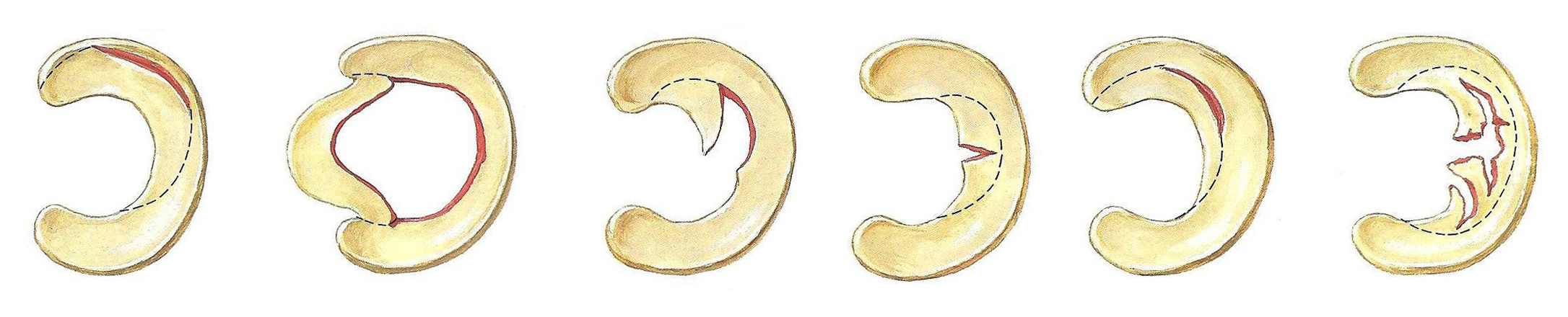 Οι εκτεταμένες περιφερικές ρήξεις παρεκτοπίζονται στο κέντρο του γόνατος μπλοκάροντας τη λειτουργία του και λόγω της μορφής τους ονομάζονται “ρήξεις δίκην λαβής κάδου”. Άλλα είδη ρήξεως είναι η κάθετη ακτινωτή, η οριζόντια, η κατ’εφαπτόμενη ρήξη ή Flap και αρκετά συχνές οι ακαθόριστης μορφής, όπως είναι οι εκφυλιστικές.