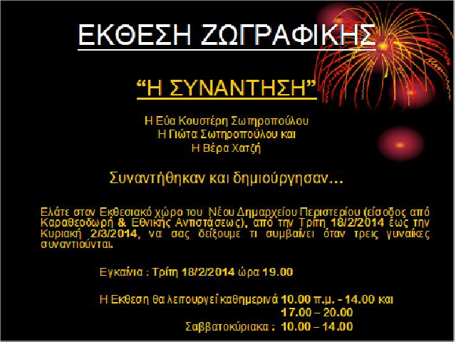 Με την υποστήριξη του Δήμου Περιστερίου, από τις 18/2/ – 2/3/2014, αυτές οι τρεις γυναίκες, θα παρουσιάσουν τις εικαστικές τους δημιουργίες, στο Νέο Δημαρχείο Περιστερίου (Σταθμός Μετρό Περιστέρι), σε ένα όμορφο και γεμάτο χρώματα περιβάλλον.