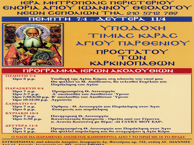 Ευρισκομένης της Τιμίας Κάρας του Αγίου Παρθενίου στο Ναό μας, σήμερα τελούνται οι Ιερές ακολουθίες ως εξής :