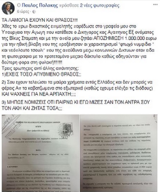 Αγωγή με την οποία ζητά αποζημίωση ύψους 1 εκ. ευρώ κατέθεσε η Βίκυ Σταμάτη σε βάρος του αναπληρωτή υπουργού Υγείας Παύλου Πολάκη ως αποζημίωση για τους χαρακτηρισμούς «φτωχό νυμφίδιο» και «νεόπλουτο τσουλί» που χρησιμοποίησε σε βάρος της σε ανάρτησή του στο Facebook.