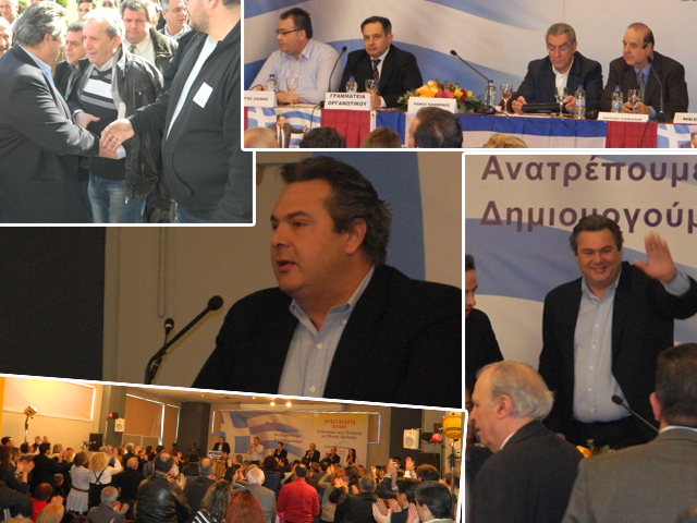 Αρκετοί υποστηρικτές του κόμματος και του κ. Καμμένου βρέθηκαν στην ομιλία του κρατώντας ελληνικές σημαίες και φωνάζοντας συνθήματα.