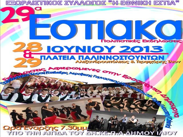 Άλλο ένα λιθαράκι στον πολιτισμό από τον Εξωραϊστικό Σύλλογο “Η ΕΘΝΙΚΗ ΕΣΤΙΑ” που για 29η συνεχόμενη φορά διοργανώνει τις πολιτιστικές εκδηλώσεις “ΕΣΤΙΑΚΑ” στις 28 και 29 Ιουνίου 2013, στη πλατεία Παλιννοστούντων στο Ίλιον.