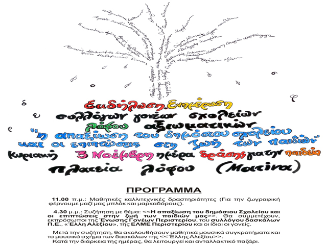 4.30 μ.μ.: Συζήτηση με θέμα: <<Η απαξίωση του δημόσιου Σχολείου και οι επιπτώσεις στην ζωή των παιδιών μας>>. Θα συμμετέχουν, εκπρόσωποι της Ένωσης Γονέων, του Συλλόγου Εκπαιδευτικών Π.Ε. Περιστερίου «Έλλη Αλεξίου», της ΕΛΜΕ Περιστερίου και οι ίδιοι οι γονείς.