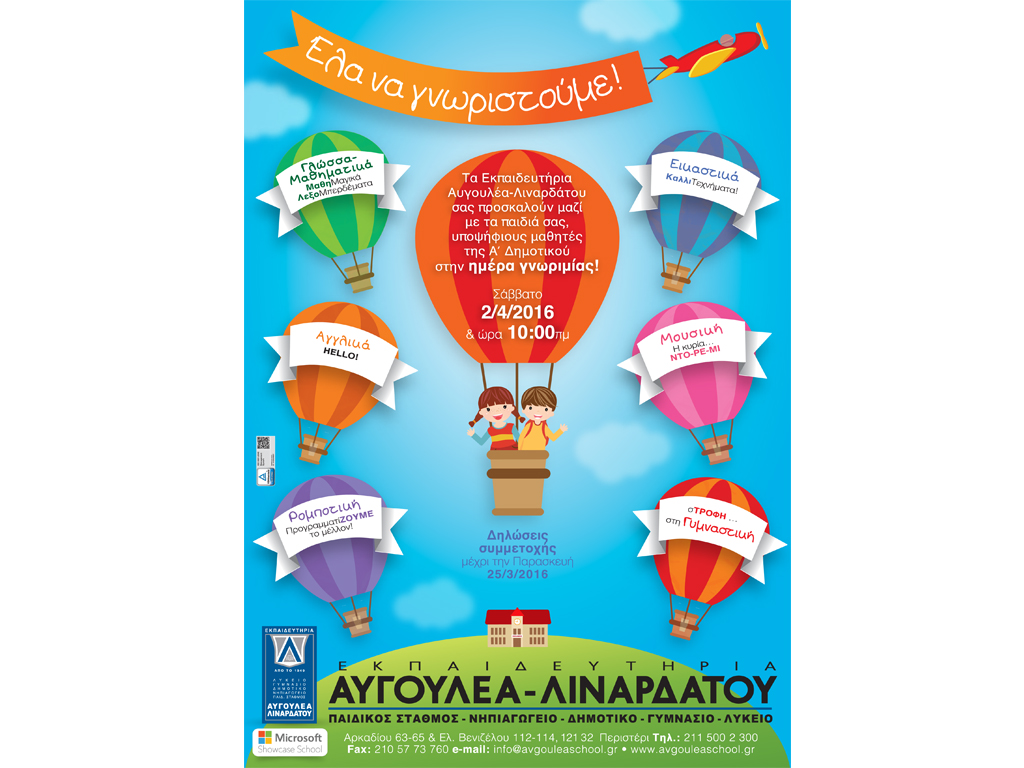 To Σάββατο 2 Aπριλίου 2016 και ώρα 10:00, τα Εκπαιδευτήρια Αυγουλέα-Λιναρδάτου καλούν τους υποψήφιους μαθητές της Α΄ Δημοτικού στην Hμέρα Γνωριμίας, στην οποία θα έχουν την ευκαιρία να διασκεδάσουν μαθαίνοντας και να έρθουν σε επαφή με το περιβάλλον του σχολείου και τα πρώτα τους γνωστικά αντικείμενα όπως ρομποτική, εικαστικά, μουσική, αγγλικά, γλώσσα-μαθηματικά και γυμναστική.