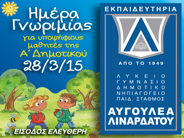 To Σάββατο 28 Μαρτίου 2015, και ώρα 9.30-11.30, τα Εκπαιδευτήρια Αυγουλέα-Λιναρδάτου καλούν τους υποψήφιους μαθητές της Α΄ Δημοτικού στην «ημέρα γνωριμίας».