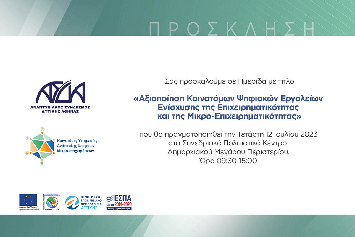 Ο Αναπτυξιακός Σύνδεσμος Δυτικής Αθήνας (ΑΣΔΑ) στο πλαίσιο των Δράσεων της ΟΧΕ/ ΒΑΑ Δυτικής Αθήνας 2014-2020, πραγματοποιεί Ημερίδα με τίτλο «Αξιοποίηση Καινοτόμων Ψηφιακών Εργαλείων Ενίσχυσης της Επιχειρηματικότητας και της Μικρο-Επιχειρηματικότητας».