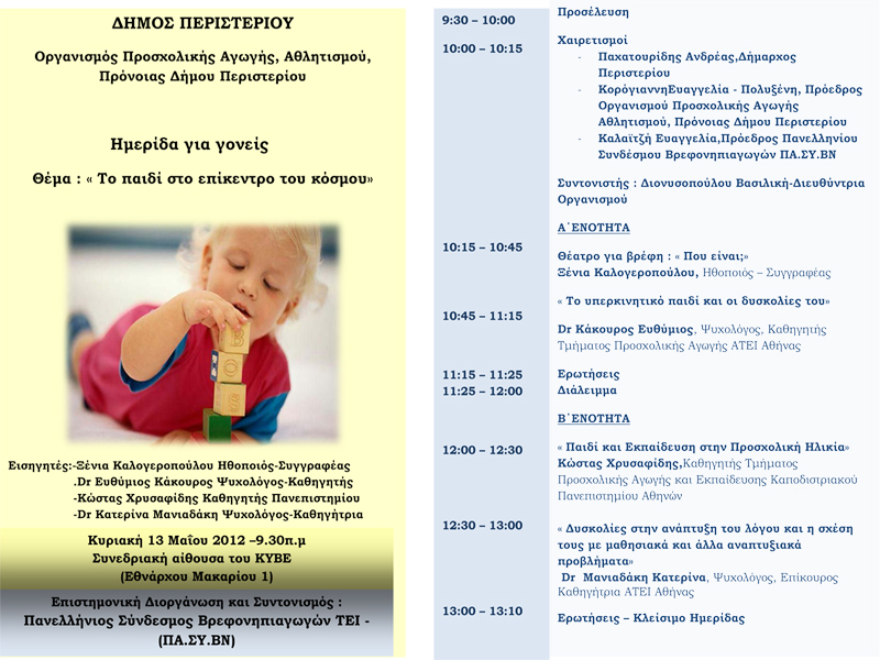 O Οργανισμός Προσχολικής Αγωγής, Αθλητισμού και Πρόνοιας του Δήμου Περιστερίου (ΟΠΑΑΠ), διοργανώνει ημερίδα για τους γονείς των παιδικών σταθμών με θέμα «Το Παιδί στο επίκεντρο του κόσμου».