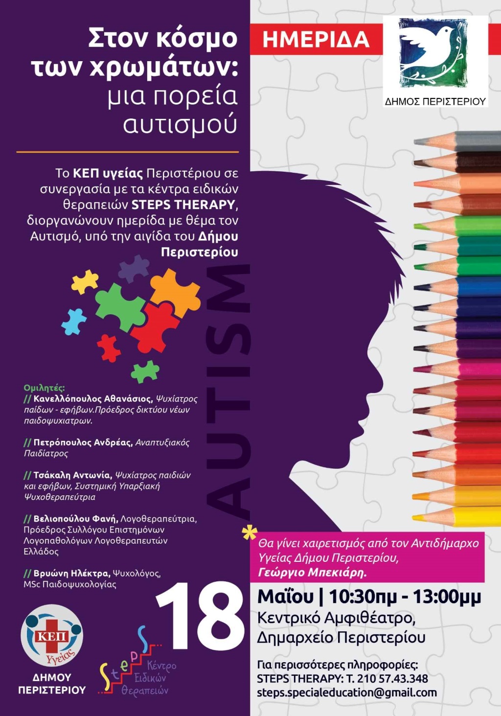 Το ΚΕΠ Υγείας Περιστερίου σε συνεργασία με τα κέντρα ειδικών θεραπειών STEPS THERAPY, σας προσκαλούν σε ημερίδα αφιερωμένη στον Αυτισμό, που θα πραγματοποιηθεί στις 18 Mαίου 2024, στο Αμφιθέατρο του Δημαρχείου Περιστερίου.