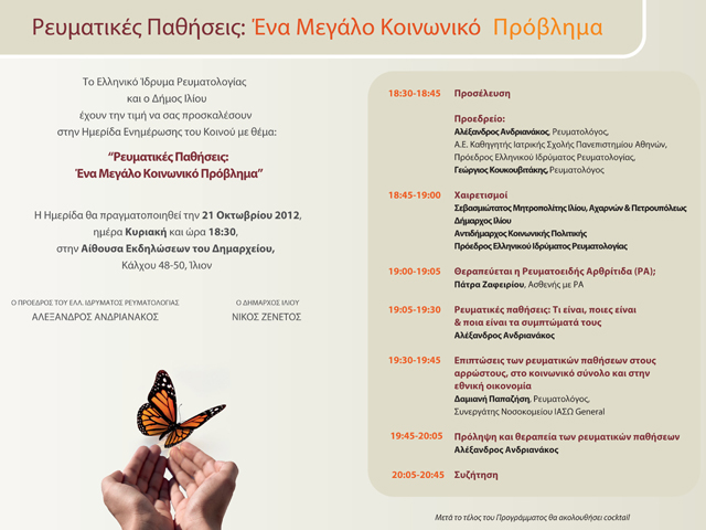O Δήμος Ιλίου και το Ελληνικό Ίδρυμα Ρευματολογίας οργανώνουν Ημερίδα Ενημέρωσης του Κοινού, με θέμα: «Ρευματολογικές Παθήσεις: Ένα Μεγάλο Κοινωνικό Πρόβλημα», την Κυριακή 21 Οκτωβρίου 2012 και ώρα 18:00, στο Δημαρχείο, υπό την Αιγίδα του Υπουργείου Υγείας & της Ιεράς Μητρόπολης Ιλίου Αχαρνών και Πετρουπόλεως.