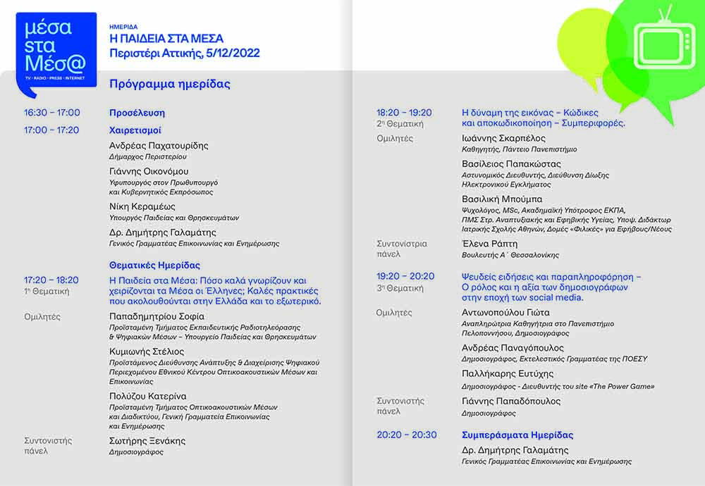 - Η Παιδεία στα Μέσα: Πόσο καλά γνωρίζουν και χειρίζονται τα Μέσα οι Έλληνες; Καλές πρακτικές που ακολουθούνται στην Ελλάδα και το εξωτερικό.