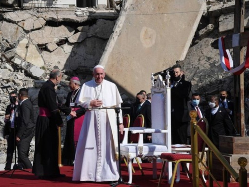 Κατά την επίσκεψή του στο Ιράκ, ο πάπας Φραγκίσκος δεν έχει πάψει να καταγγέλλει «τα όπλα», «την τρομοκρατία που καταχράται τη θρησκεία» και «τη μισαλλοδοξία».