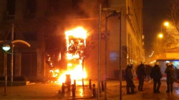 Επί έξι ώρες σημειώνονται οδομαχίες, ρίψη χημικών, ενώ καταστήματα, υποκαταστήματα τραπεζών, ιστορικά κτίρια της Αθήνας έχουν γίνει παρανάλωμα του πυρός. Μάλιστα λίγο μετά τις 23:00 το βράδυ έγινε πλιάτσικο σε καταστήματα εμπορίας όπλων στην Ομόνοια.