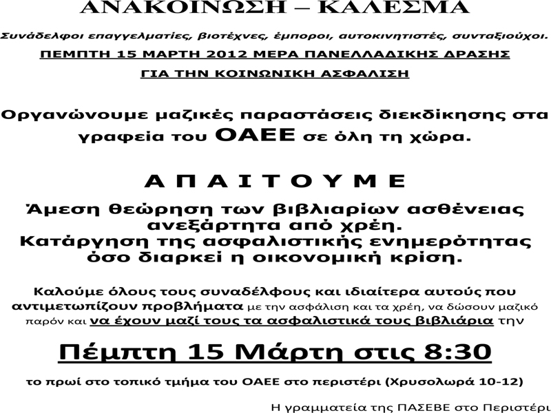Η γραμματεία της ΠΑΣΕΒΕ στο Περιστέρι καλεί όλους τους συναδέλφους στο τοπικό τμήμα του ΟΑΕΕ (Χρυσολωρά 10-12) την Πέμπτη 15 Μάρτη στις 8:30 το πρωί για να απαιτήσουμε: