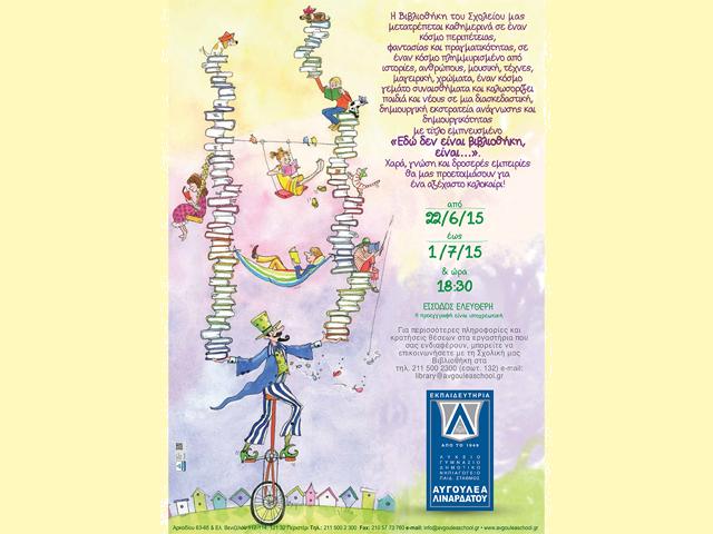 Από τη Δευτέρα 22 Ιουνίου 2015 έως την Τετάρτη 1 Ιουλίου 2015 6.30μμ, η ΒΙΒΛΙΟΘΗΚΗ ΤΩΝ ΕΚΠΑΙΔΕΥΤΗΡΙΩΝ ΑΥΓΟΥΛΕΑ-ΛΙΝΑΡΔΑΤΟΥ διοργανώνει μια καλοκαιρινή «εκστρατεία» ανάγνωσης και δημιουργικότητας για παιδιά 6 έως 10 ετών, με τίτλο «Εδώ δεν είναι βιβλιοθήκη, είναι…», στο πλαίσιο της συμμετοχής της στο πρόγραμμα του Future Library.