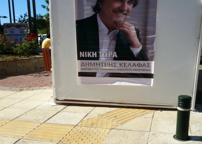 Ο υποψήφιος δήμαρχος Περιστερίου Δημήτρης Κελάφας, διεκδικεί τη ψήφο των συμπολιτών του τοποθετώντας το προεκλογικό του περίπτερο πάνω σε διάβαση για άτομα με ειδικές ανάγκες!