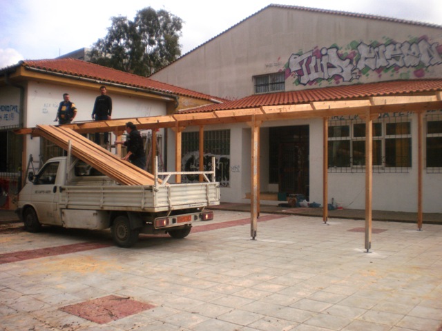 Τεχνικά συνεργεία του Δήμου Αγίων Αναργύρων – Καματερού κατασκεύασαν ξύλινο σκίαστρο – στέγαστρο στο προαύλιο του 7ου Δημοτικού Σχολείου Καματερού.