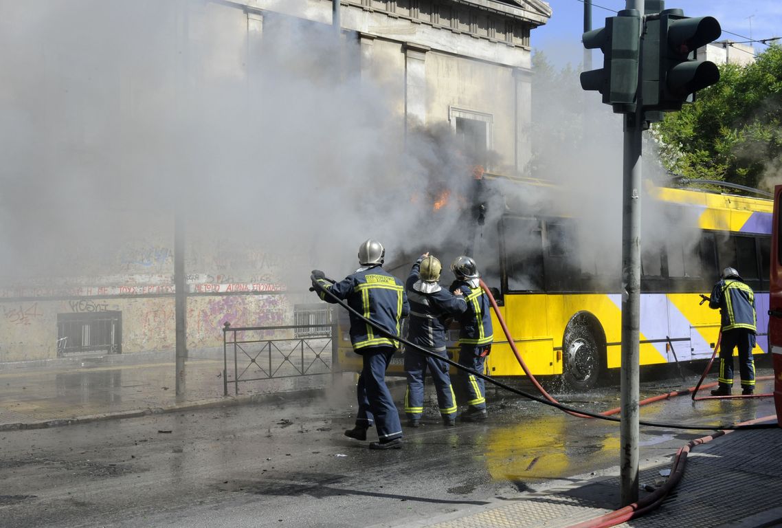 (φωτογραφία αρχείου) Το ποσό των 700.00 ευρώ καλείται να καταβάλλει το ελληνικό Δημόσιο με απόφαση του Συμβουλίου της Επικρατείας, για την ολοσχερή καταστροφή δυο λεωφορείων της ΕΘΕΛ Α.Ε. που κάηκαν από μολότοφ περιθωριακών ομάδων, λόγω της έλλειψης κατάλληλων αστυνομικών μέτρων.