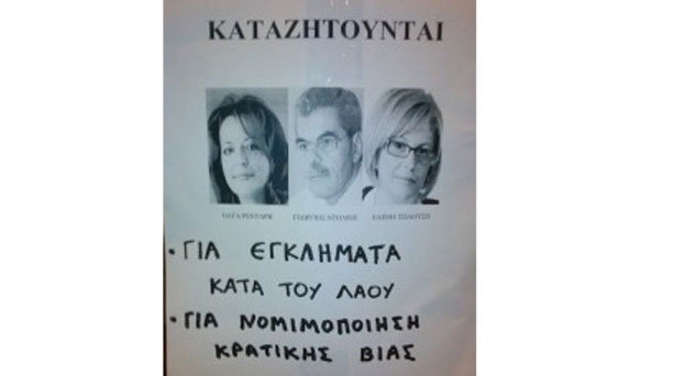 Μάλιστα κυκλοφόρησαν και αφίσα με την οποία «καταζητούν για εγκλήματα κατά του λαού και για νομιμοποίηση κρατικής βίας» τους Γιώργο Ντόλιο, Όλγα Ρενταρή και Ελένη Τσιαούση.
