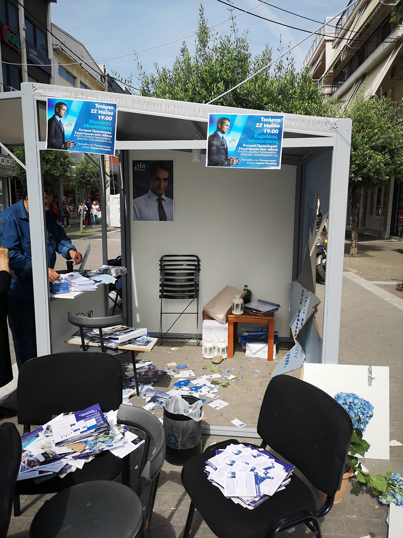 Χθες το βράδυ άγνωστοι επιτέθηκαν στο εκλογικό περίπτερο της Νέας Δημοκρατίας επί της Εθνικής Αντιστάσεως προκαλώντας υλικές ζημιές στην ξύλινη κατασκευή και στο προεκλογικό υλικό που βρισκόταν μέσα.