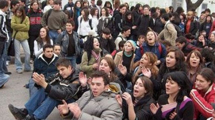Ομάδα περίπου 100 ατόμων έχουν καθίσει στην άσφαλτο σε σχήμα τετραγώνου και φωνάζουν συνθήματα κατά της διεύρυνσης του ωραρίου τους από 7 ώρες σε 8.