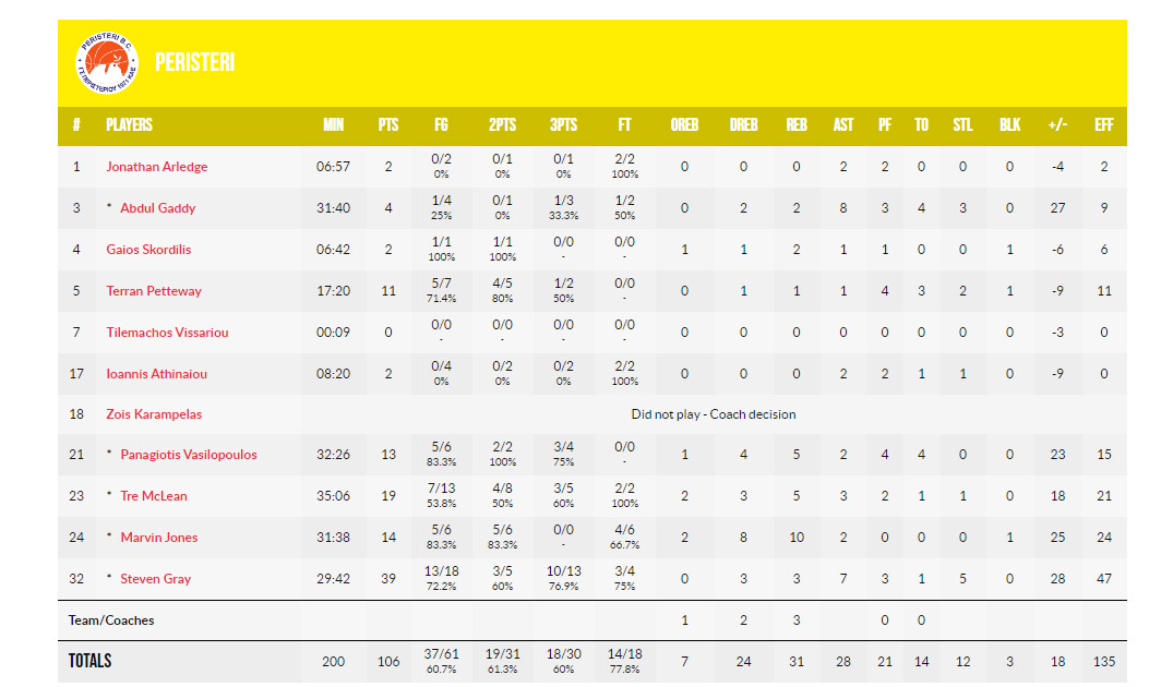 Διαστημική εμφάνιση από τον Στίβεν Γκρέι που είχε 39(!) πόντους με 10/13 τρίποντα, με άξιους συμπαραστάτες τους ΜακΛίν με 19, Τζόουνς με 14 και 10 ριμπάουντ, Βασιλόπουλο 13 και τον Γκάντι που είχε 4 πόντους και 8 ασίστ.