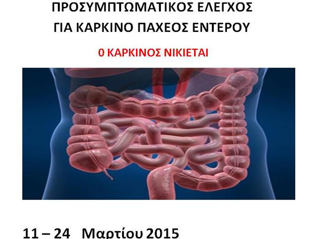 Δωρεάν προσυμπτωματικό έλεγχο για καρκίνο Παχέος Εντέρου από 11 έως 24 Μαρτίου 2015, προσφέρει το Κέντρο Υγείας Περιστερίου.