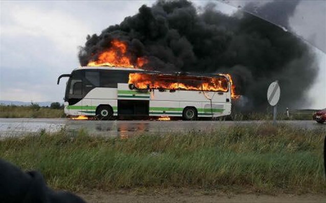 Το λεωφορείο τυλίχθηκε αμέσως στις φλόγες. H πυροσβεστική υπηρεσία έφθασε έγκαιρα στο σημείο και απέτρεψε την εξάπλωση της πυρκαγιάς.