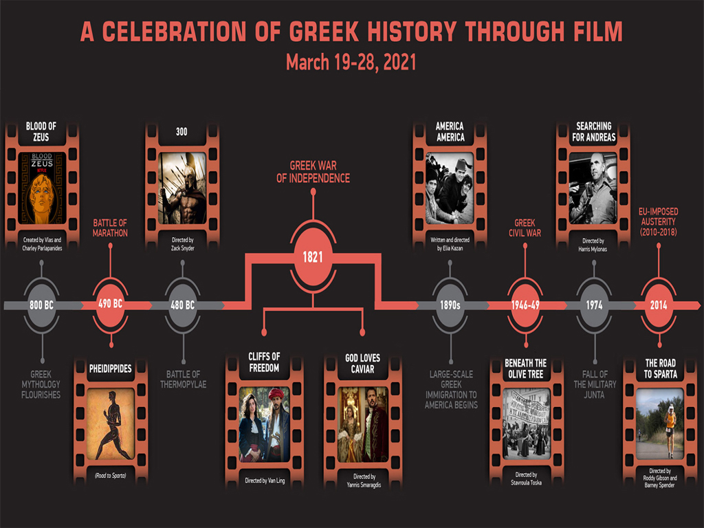 Επτά ταινίες και ένα πρωτότυπο επεισόδιο Netflix, όλα εμπνευσμένα από την ελληνική ιστορία, από τους Περσικούς πολέμους έως σήμερα, θα προβληθούν παγκοσμίως διαδικτυακά από τις 19 έως τις 28 Μαρτίου. Κάθε παρουσίαση θα συνοδεύεται από συνομιλίες με κινηματογραφιστές που θα παρέχουν ιστορικό πλαίσιο και πληροφορίες σχετικά με τη δημιουργία της ταινίας.