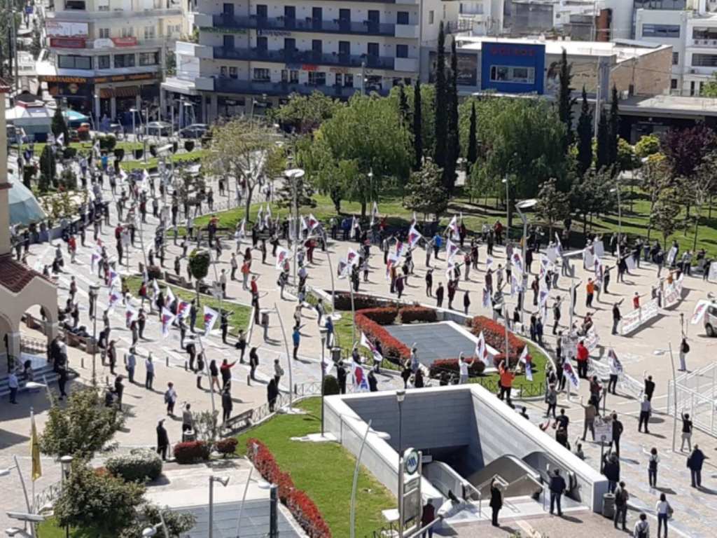 Τηρώντας όλα τα απαραίτητα μέτρα προστασίας, πραγματοποιήθηκε συμβολική κινητοποίηση στην πλατεία Δημαρχείου στο Περιστέρι από το ΠΑΜΕ, όπου οι εργαζόμενοι φώναξαν ότι «η Πρωτομαγιά δεν είναι αργία, είναι απεργία».